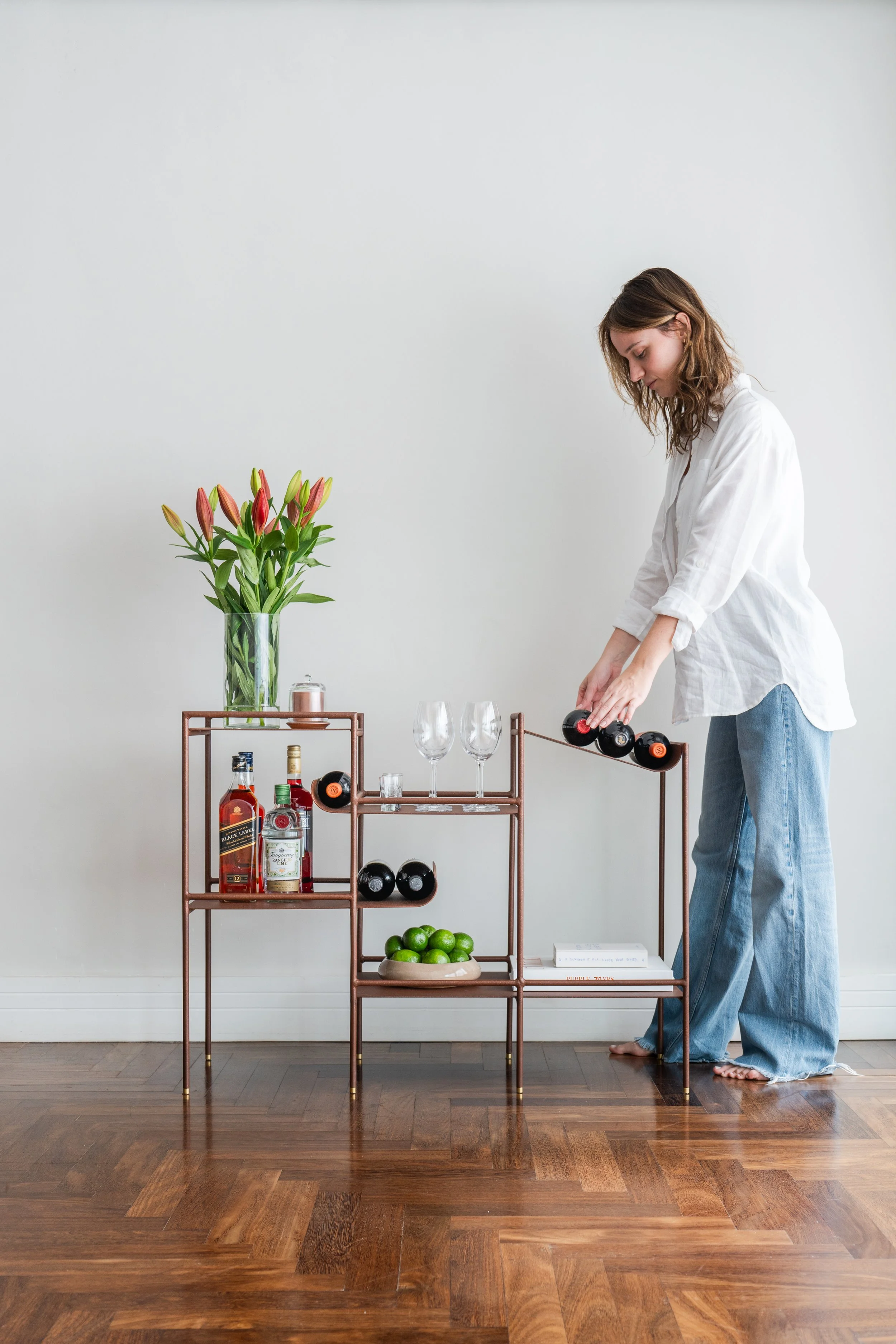 O projeto do Bar Ritmo teve como partido criar sensações: de movimento, dada pelas diferentes dimensões, formas e disposições de suas prateleiras, que remetem a uma partitura musical com suas notas e pausas; e de delicadeza e resistência, possibilitadas pela esbeltez da estrutura em aço carbono, que contrasta a força do material com a leveza visual do projeto.